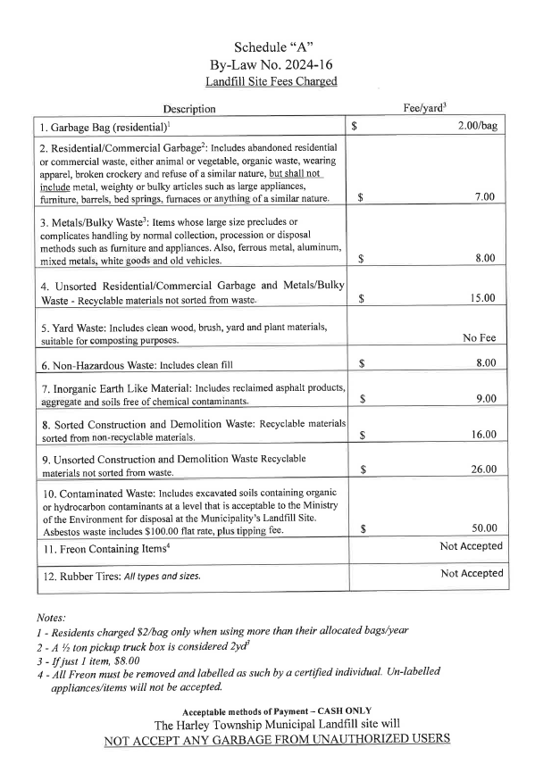 See below information regarding the Harley Landfill and Tipping Fees By-Laws